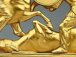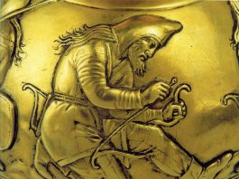 The human skull covered with gold plates of two patterns was found in the central chamber of a Scythian barrow near the village of Synjavka in the Cherkasy oblast of Ukraine in 1845. The burial dates to the VI century BC and is known as Synjavka Barrow No. 100. The plates were sewn onto a cap, but over the centuries the material decayed and at the time of the discovery, the plates looked as if they were attached directly to the skull. Below is how the cap must have looked during the burial.
