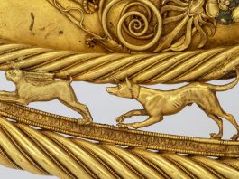 “The Dharma-wheel, the symbol of the Buddha’s teachings—here celebrated as a gift by its donors—has been central to Buddhist practice from its beginnings. The Lalitavistara, an early Sanskrit text recounting the life of the Buddha, describes its veneration: “It was an exquisite wheel adorned with all kinds of jewels. . . . It had a hub, a rim, and a thousand spokes. It was adorned with flower garlands, lattices of gold, tassels with bells[, and] various marks of auspiciousness, beautifully wrapped in divine fabrics and dyed in different colors. It was strewn with flowers of the heavens . . . and rubbed with perfumed ointments”