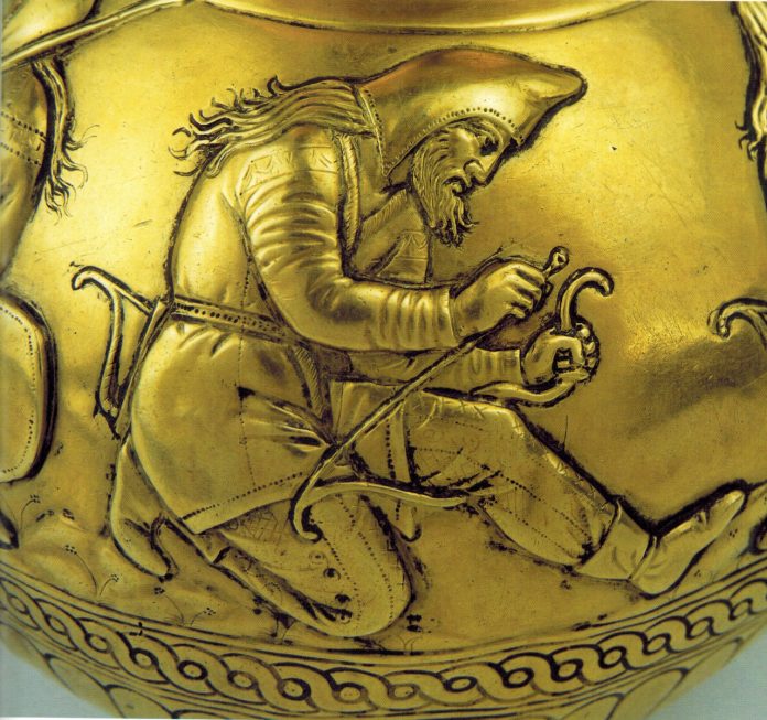The elite Scythian (UkrEIA_Scythian_SivDon_NomEl_3) with Slavic-like genetic associations and haplogroup R1a-Z645 was from that burial in the village of Karavan, which is attributed to the nomadic elite. The mound was 5m high. Although the burial was looted, the remains of a Greek amphora, eight gold plaques decorated with ornaments, fragments of a silver rhyton decorated with a bull’s head, bronze vessels with gilding, and bronze arrowheads were found in it.