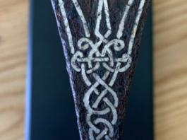 Of particular interest is the sword, which has been preserved entirely except for the tip. The hilt is covered with a chased silver band riveted with silver studs. The embossed and engraved pattern features an interweaving of lush, rich, stylized plants, intertwined with knots. A completely similar pattern is found on the second bull horn from the Black Barrow. Not only is the nature of the pattern on both pieces the same, but also the technique of execution: the design was outlined with a double contour, and the interior was shaded and covered with gilding.